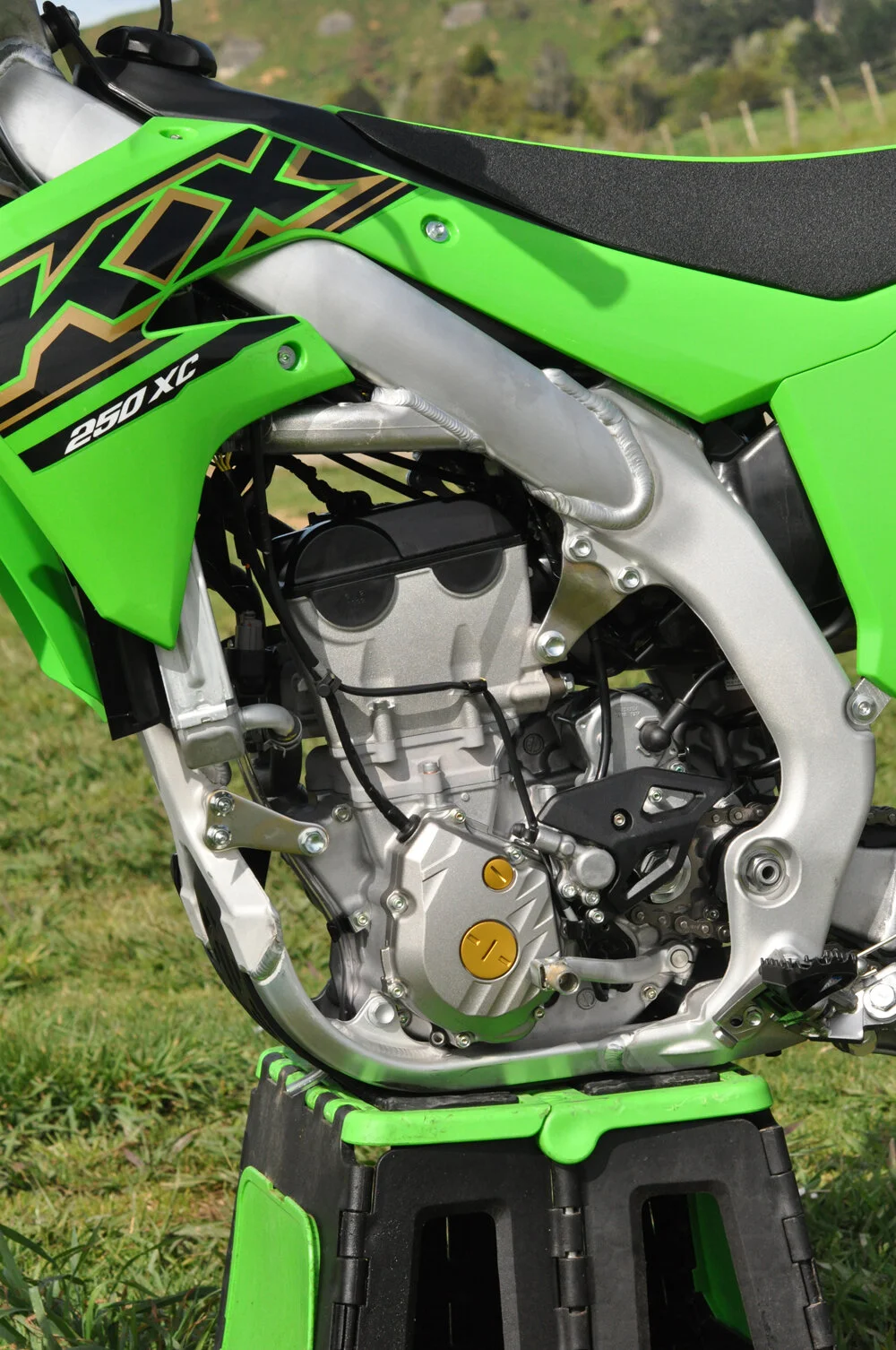 Like the KX250, the KX250XC is equipped with dual fuel injectors. One positioned downstream of the throttle valve (usual spot) and one upstream close to the airbox. This design is said to deliver a smooth and instant response, matched with increased engine output and high RPM. There is no doubt that the power from the 250 XC exceeds a few other brands without question and is now probably on par with a few others too. Obviously, Kawasaki believe in the two-injector system for its lites class bikes and who am I to disagree.